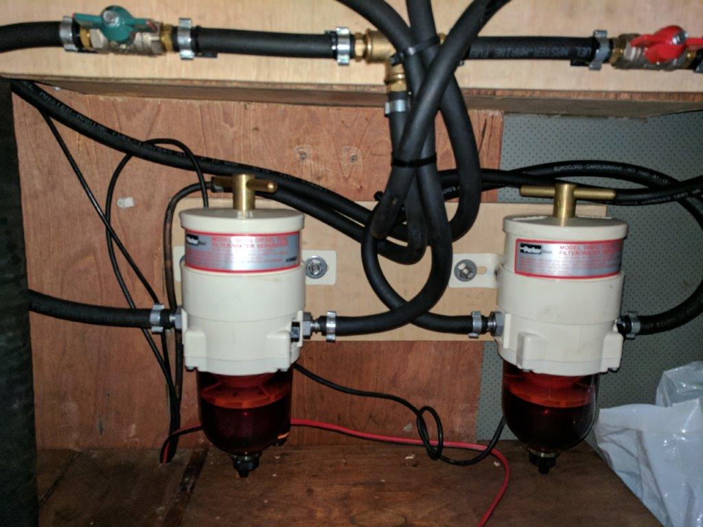 This is about the filters on the engine itself, not the primary filters elsewhere in the boat but typically towards the rear of the engine compartment. On my set up, because of the near impossible task of looking in the tanks, I fitted two Racor fuel polishing units with switch over valves to replace the standard glass bowl primary filter types. I did this mainly because replacing the filters in these units is a simple matter of undoing a big nut on the top and switching the filter. I can do one independently of the other which is useful at sea.