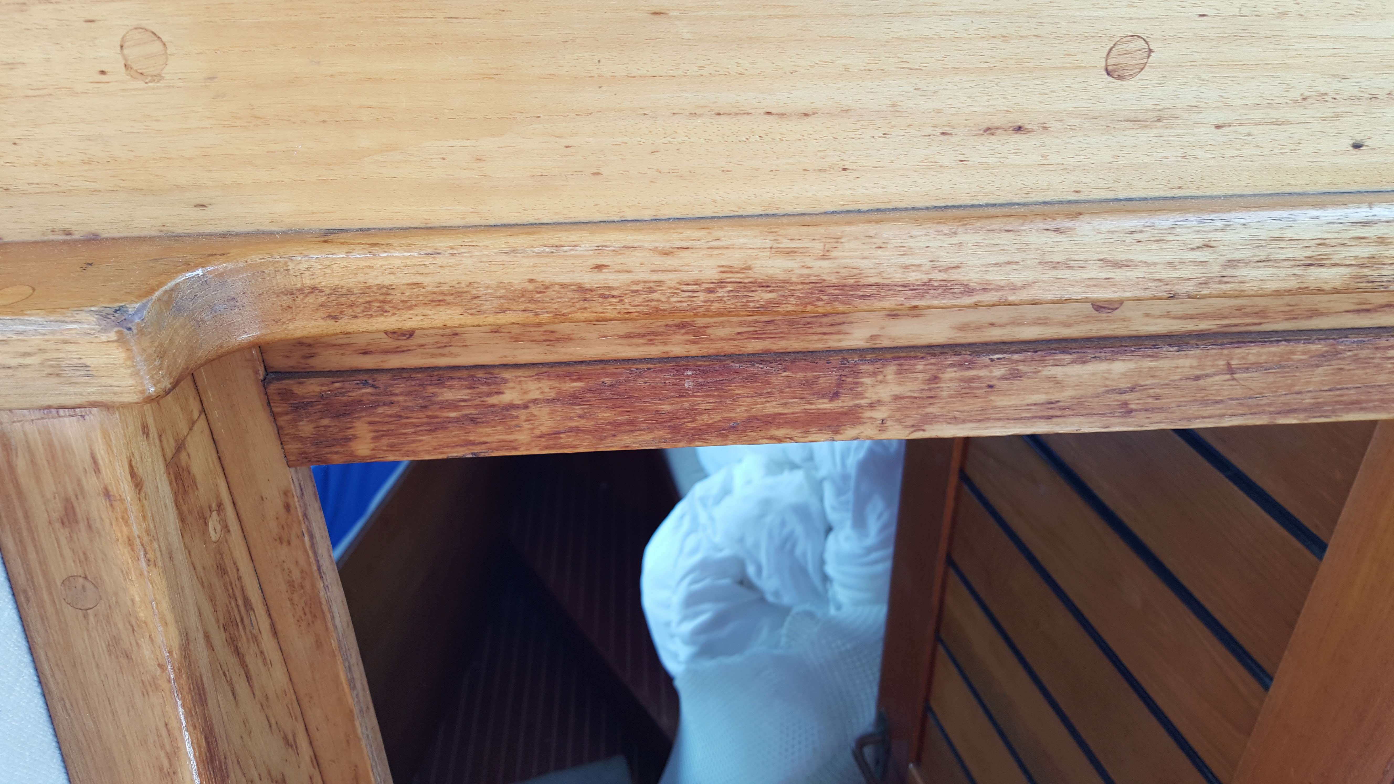 No sanding, no chemical used, just teak water coulouring over stains and wipping around undamaged varnish with alcool (varnish alcool).I still have one place where very ample condensation totally ruined the varnish, I’ll cope with that latter, no idea how yet.