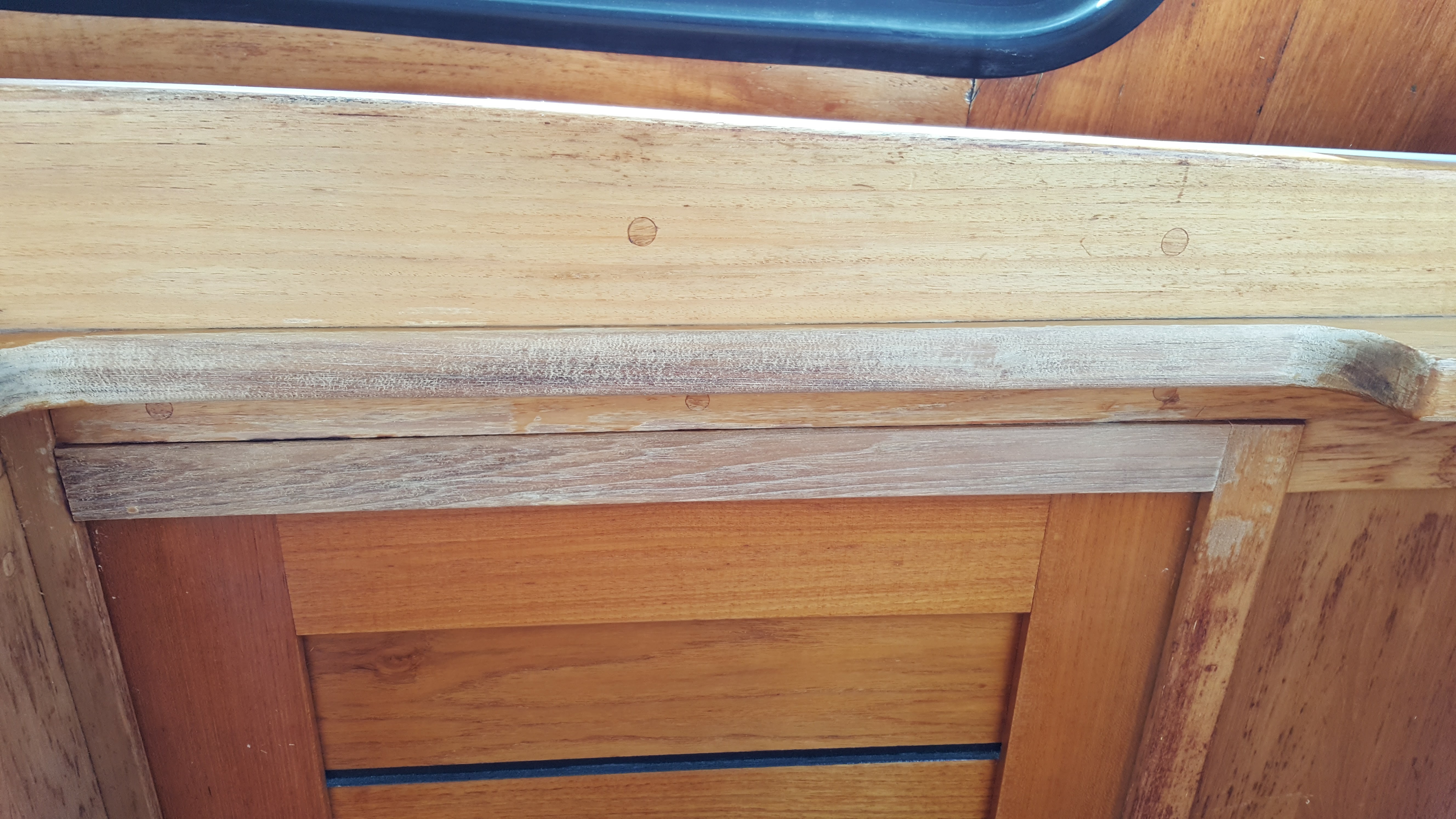 I refer to the change in colour on the solid (eg not veneered) wood at up and left angle of left window. I faced that change in coloration when revarnishing wooden frame of dinette table in the helm house. I feel the difference is due to a difference in absorption of varnish by the wood, I think old varnish remains prevent absorbtion and yeld lignter colour. I’ll have to redo the varnish after deep sanding to homogenise the absorbtion which is no problem with solid/massive wood.
